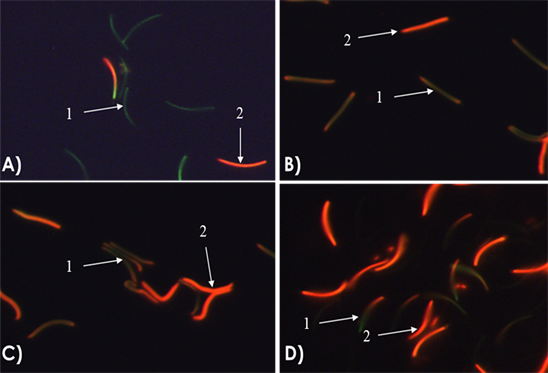 Figure 3. The Venda cockerel semen viability determined by staining with SYBR-14/PI for semen treated with (A) 0 µM H2O2, (B) 5 µM H2O2, (C) 50 µM H2O2 and (D) 200 µM H2O2after 16 hrs of treatment, where the green cells [1] indicates live or moribund live cells and red cells [2] indicating dead or non-viable cells at 100× of magnification.