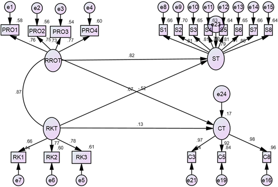 Table 2 includes the CR, AVE, square root values of AVE and inter-factor correlations that were used to assess the CR, convergent validity and discriminant validity. CR coefficients in Table 2 were between 0.857 and 0.967 which were higher than the cut-off point of 0.7. AVE values were in between 0.504 and 0.914 that were higher than the cut-off point of 0.5 and indicated that there was convergent validity. Moreover, the square root values of AVE in all constructs were higher than the inter-factor correlations which indicated that there was discriminant validity.