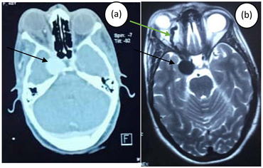 Figure 2. (a) Contrast enhanced brain computer tomography, axial section on parenchymal window, showing a round hyperdense lesion on the right carotid-cavernous sinus (black arrow). Extraocular muscle thickening and periorbital oedema. (b) Brain MRI, axial T2-weighted sequence with spontaneous high flow unilateral right carotid-cavernous fistula secondary to the aneurysmal rupture; ectasia of right ophthalmic vein (green arrow).