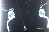 On physical and neurological examination, she was conscious and well oriented in time and space; a little bit anxious, holding her forehead in the hands and unable to close the right eye with obvious eyeball protrusion. The eyeball was red, hyperemic, presence of peribulbar arterialized loops with murmurs (bruit) overheard when the stethoscope is put on the eyelid. There was no fever, and no sensitive or motor palsy.
