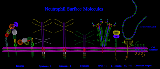 Proteoglycans and hyaluronan comprise the neutrophil surface layer. The integrins are related to, rolling, arrest, adhesion, crawling, transmigration and diapedesis. The CD 44, L-selectin and PSGL-1, respectively the first for tethering, rolling, arrest and adhesion, while the others for tethering and rolling.