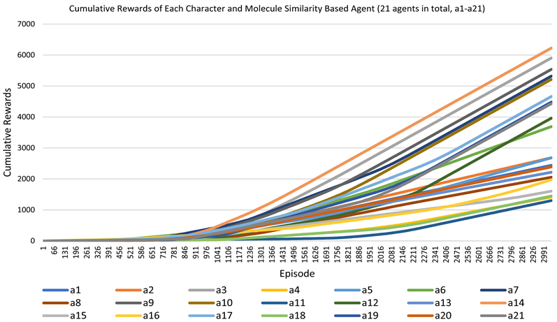 The range of molecule similarity between learning and target molecules in Table 1 is (0, 1) and that of character similarity is (0, 21). To visualize the correlation between character similarity and molecule similarity in the reinforcement learning process, we scaled the molecule similarity from (0, 1) to (0, 21). Three experiments were conducted and the average of the collaborative learning outcomes from the multiple actor-critic agents were collected (Figure 2). To smooth the collaborative learning curves, a moving average of window size 50 was applied. The molecule similarity increased as the character similarity (Figure 2). Each agent’s cumulative rewards based on the reward function introduced in Table 1 are shown in Figure 3, with a total of 21 agents. Varied learnability of different 21 sites was observed in Figure 3 and the 21 reward curves were not clustered together at the end.