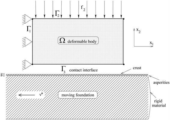 is depicted in Figure 1. Here, we consider the frictional contact between a deformable body and a moving foundation. This specific foundation is composed of a rigid material covered by a thin crust and a deformable layer of asperities of depthg. Here g represents the maximum value of the allowed penetration in the foundation. When this value of penetration is reached, the contact follows a unilateral condition without any additional penetration. This kind of foundation is characterized by contact condition (8). Since the foundation is moving the friction condition is in a slip status within Coulomb’s form (7). The deformable body is