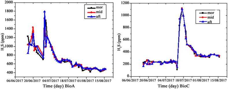 traces when the biogas obtained is analyzed. This is not the case for our two systems, which is why we have had H2S proportions of up to 1800 ppm in the BioA (Figure 9). However, H2S is not only a corrosive gas, but it is also a gas that is highly dangerous for living organisms depending on the quantity inhaled [14] [15] [16] [17] and [18].