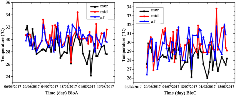 These behaviors from the point of view of the average temperature allowed us to understand the variation of the digester temperature as a function of the monitoring period with peaks observed at midday and the lowest temperatures recorded in the morning (Figure 4).