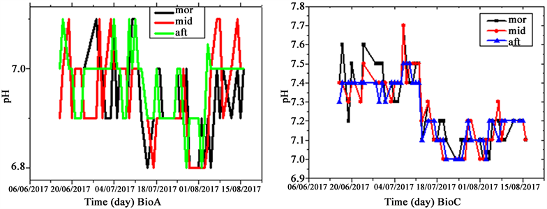 The pH of our two digesters varies within the admitted ranges, with values ranging from 6.8 to 7.5 for BioA and from 7.2 to 7.7 for BioC as shown in Figure 5 [9]. The fact is that the pH in BioC is much more stable. And this could positively affect the pressure as well as the percentage composition of methane (CH4) in the biogas composition of this digester. On the other hand, for laboratory or industrial scale digesters, pH variations are often corrected with the introduction of chemicals (soda in well-defined proportions) into the reactors [10]. This is not the case in our study because we want to have information on the actual behavior of the reactors in-situ.