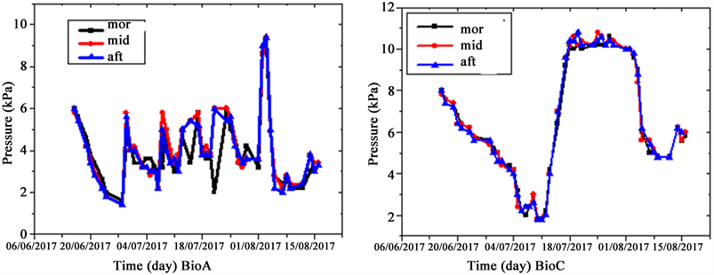 displayed by the needle of the manometer could be read directly, which allowed us to follow the evolution of the pressure throughout the monitoring of our two systems (Figure 6). The pressure at the BioA level varies globally from 0.9 to 9.4 kPa, with a slight variation during the setting hours. Most of the time, the pressure is lower than 6 kPa. On the other hand, for BioC, the pressure varies between 1.8 and 10.8 kPa and is much more stable during the setting hours, with values often higher than 6 kPa. In fact, a 10 m3 digester in normal operation can reach a value of 12 kPa. But this value depends on the experimental conditions. In this case, the digesters are not loaded every day, because there is no daily supplier. Since the loading is not regular, it would be very difficult to speak in terms of the exact yield of gas produced.
