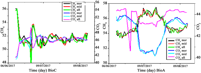 Figure 7. CH4 and CO2 content in biogas from the two digesters as a function of time.