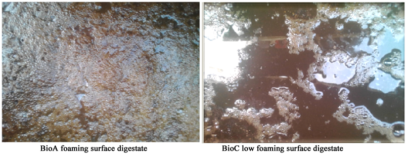 Moreover, another phenomenon could also explain these different behaviors; at the BioA level, the digestate is very foamy compared to that of BioC (Figure 8). This is often created by the accumulation of NH3 and long-chain fatty acids [13]. Hence the decrease in biogas production at the BioA level.
