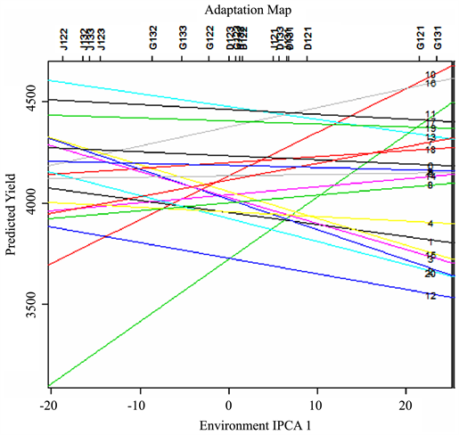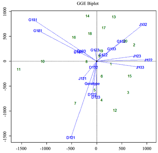 The genotypes G11 and G12 were lower mean grain yield located to the left of the perpendicular line (grand mean). The genotypes, which nearly placed to the origin (G6 and G8) with lower contribution to the magnitude of genotype by environment interaction implying that the genotypes were stable. The genotypes, G2, G3, G15, G11 and G12 were located distant from the origin which was interactive genotypes contributing much to the increasing magnitude of genotype by environment interaction and they were the most unstable. The environment 121 proceeded by J121 and G131 appeared as favorable environments. The genotypes G13 and G19 produced high yield (kg∙ha−1) in the favorable environments. The genotypes G16 and G18 high IPCA1 scores, indicated sensitivity to mega-environmental changes.