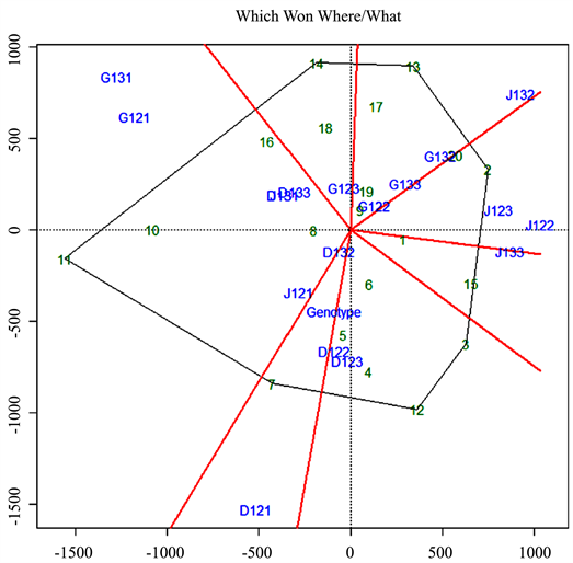 Figure 4. Polygon views of the GGE biplot based on symmetrical sealing for the which-won-where pattern of genotypes and environments.