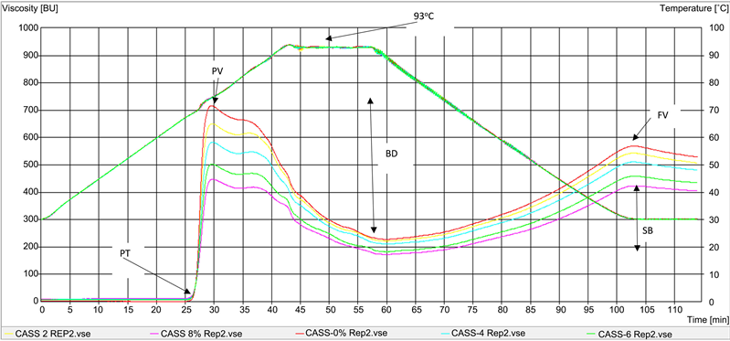 GA, the peak viscosity (PV) values decreased significantly. The same trend can be observed for the FV, BD and SB where a significant decrease with increasing substitution level of GA can be observed, though at lower levels (0.5% and 2%) the viscosity parameters were not significantly different from the control sample (0% GA).