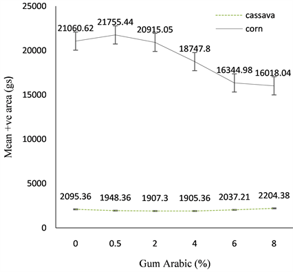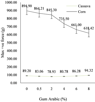 Presence of GA in cassava starch gels resulted in slight increase in consistency which can indicate strengthened structure of the gels that resulted from interactions between the polymers. The peak or maximum force is taken as a measurement of consistency during textural measurements of starch gels by back extrusion (Figure 2(b)), the higher the value the thicker the consistency of the sample [37]. In the case of corn starch gels consistency of corn starch decreased with an increase in the levels of GA. The consistency of corn starch gels at higher gum concentration (8%) was significantly lower than the native corn starch and this may be attributed to the fact that the gum helps to weaken the amylose networking by impeding between the amylose molecules. These results also indicate that an increase in the concentration of the gum reduces the strength of the internal bonds hence decreasing the resistance to structural disintegration. This behavior can be attributed to reduced leaching of amylose molecules responsible for strengthening the internal bonds of starch gels [11] [20] [35]. It is worth noting that when comparing cassava and corn starch gels without GA, the cassava gel strength occurred to be ten times less than that of the CS gel while the presence of GA particularly at the lower substitution levels with starch resulted in reduction of differences in the strength values of the respective gels.