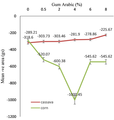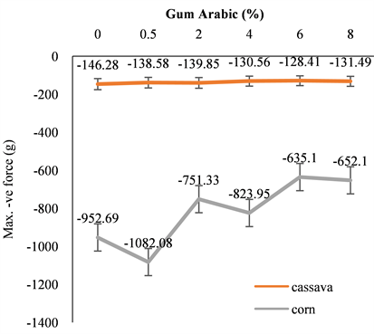 The maximum negative force is taken as an indication of cohesiveness of the sample therefore the more negative the value the more “cohesive” is the sample. Cohesiveness indicates the strength of bonds which includes a mutual effect of cohesive and adhesive forces along with elasticity and viscosity [20]. The present study findings shows that gum Arabic did not have an impact on the cohesiveness of both starches’ however, corn starch gel was more cohesive than cassava starch gel and this could be due to high amylose content in corn starch (Figure 2(c)). This behavior can be explained by the same interactions that influenced the firmness and consistency of the starches with added GA for instance coating the granules, restricting swelling and a reduction in leaching of amylose also as suggested by [31] for xanthan gum, however this should be further investigated. Similarly, findings reported by [36] on the influence of cassia gum on textural properties of potato and corn starch gels, showed that for all the parameters determined, potato starch gel in most cases occurred to be lower than those of respective corn starch gels. The area of the negative region of the curve may be referred to as the work of cohesion and the higher the value the more resistant to withdrawal the sample which is an indication of the consistency or viscosity of the sample [37] [38]. There was an increase in the work of cohesion for CaS gels as compared to CS gels (Figure 2(d)). It appears that CS gels require considerably more force to penetrate to the same depth as CaS gels may be attributed to strong associative forces between CS granules. According to [39] the addition of 1.5% Arabic gum was the most effective in reducing the in vitro starch digestibility and improving the cooking properties of noodles.