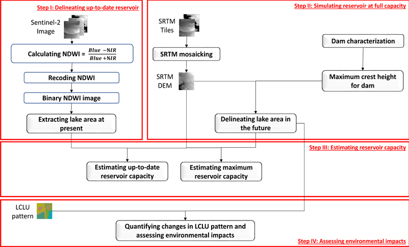 This paper is intended to develop an integrated analysis framework of remotely-sensed data and GIS techniques for delineating surface area of the dam reservoir, simulating their capacities and assessing associated impacts environmental impacts with application to Grand Ethiopian Renaissance Dam (GERD).