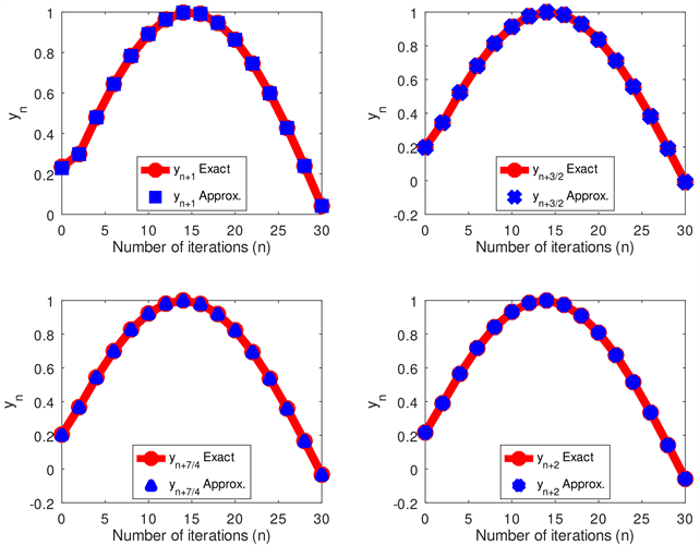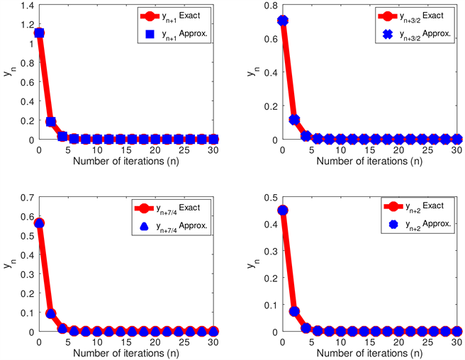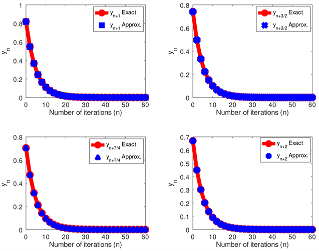 and the results are as shown in Figures 2-5. It can be observed from the first four figures of Figure 2 that the Two-Step Butcher’s scheme in block form performed at par with the exact solution. Since we are solving a linear system of equations in each iteration, we plotted the values of n against the norm of the residual