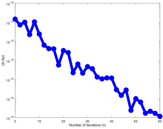 had the least absolute error compared to the rest. Since we are solving a linear system of equations in each iteration, we plotted the values of n against the norm of the residual