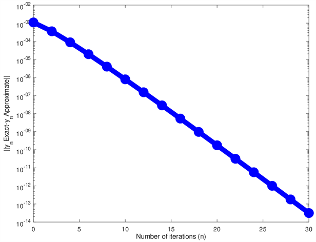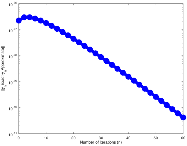 on a semilogy scale and the result is as shown in Figure 9. We observed that as n increases, the norm of the residual decreases as expected. In the same vein, Figure 10 shows a plot of the norm of the Error between the Exact and Approximate values of