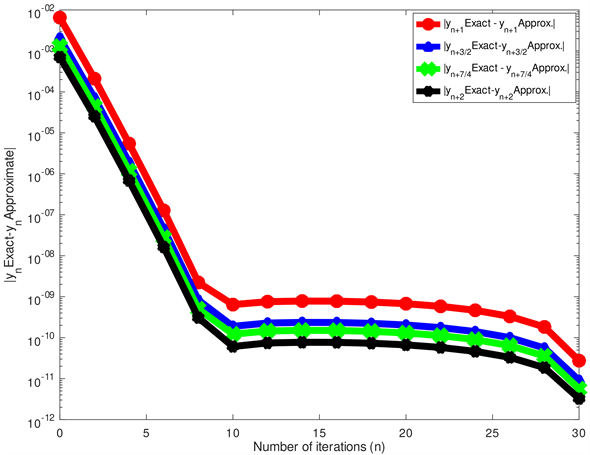 shown in Figures 11-15. It can be observed from the first four figures of Figure 11 that the Two-Step Butcher’s scheme in block form performed at par with the exact solution. Since we are solving a linear system of equations in each iteration, we plotted the values of n against the norm of the residual