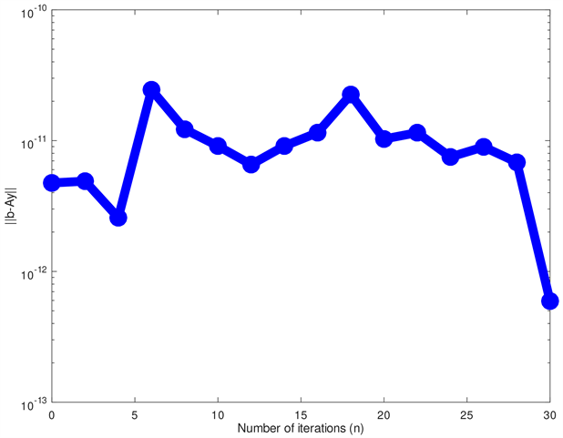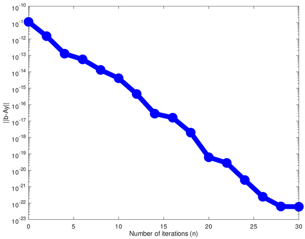 on a semilogy scale and the result is as shown in Figure 12. It can be observed that as n increases, the norm of the residual decreases as expected. In the same vein, Figure 13 shows a plot of the norm of the Error between the Exact and Approximate values of