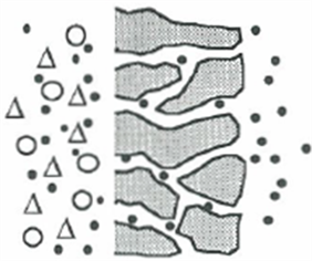 The first type is that of the porous membrane and is shown in Figure 2. These membranes have a mean pore size diameter of 0.001 - 5 µm. With porous membranes, molecules move based on a pressure-driven convective flow through the tiny pores of the membrane, which are bigger than 10−9 m. The different compound permeabilities is a result of the differences in steric hindrances between the components molecules and the membrane material. Within a porous membrane, the concentration of permeants is uniform, with the sole driving force across the membrane being the pressure gradient [9].