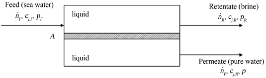 Here, the subscriptsr and p identify the retentate and permeate conditions, respectively. In the solved solution diffusion model, the results confirmed that flux rate is proportional to a gradient in the chemical potential and pressure drop. As previously stated, reverse osmosis is primarily employed for the desalination of saltwater. In this arrangement, membranes that are permeable to water yet impermeable to salt are exploited. The objective of water desalination is the production of fresh water at the permeate side. In Figure 8, the schematic of a membrane module for water desalination is presented. Because a pressure difference is administered across the membrane, a liquid mixture at both sides can be expected. Pressurized water which possesses dissolved salts contacts the feed side of the membrane. At the same time, water that has had its salt removed is withdrawn as a low-pressure permeate. This section seeks to express the flux equations in terms of the pressure gradient through the membrane and render them linear.