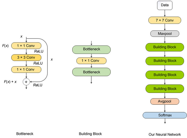 The left-hand side of Figure 1 shows the bottleneck, a component of the residual neural network, which can be defined as: