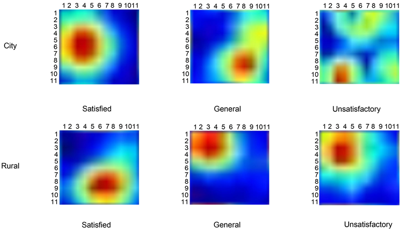 The Grad-CAM technique makes our model more transparent by generating a visual interpretation of which regions play an essential role in the decision-making of the neural network. We, therefore, selected six individuals from the data of teachers successfully predicted by the neural network model: three teachers who were satisfied, generally satisfied, and dissatisfied with online education in the urban teacher, and three teachers who were satisfied, generally satisfied, and dissatisfied with online education in the rural teacher. The data from the six teacher samples were processed using Grad-CAM technology, and Figure 3 below shows the results of our experiment.