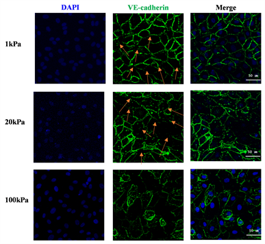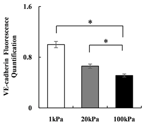 Figure 4. The integrity of cell-cell junctions was impaired on higher substrate stiffness. (a) Immunofluorescence staining of VE-cadherin (green) and DAPI (blue) in HUVECs cultured on 1 kPa, 20 kPa and 100 kPa substrate. (b) The fluorescence quantification of VE-cadherin (n = 3), *p < 0.05.