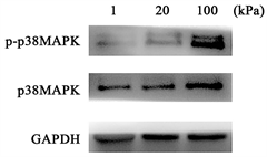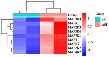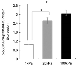 cultured on softer (1 kPa) and stiffer (100 kPa) substrates revealed that the expression of MAPK signaling pathway-related molecules MAP2K3, MAP2K7, MAP3K3, MAP3K6, MAPK3, MAPK7, as well as RHO family interacting cell polarization regulator 1 (RIPOR1), ras homolog family member (RHOF), ras homolog family member related to GTPase activity T2 (RHOT2), TGF-β activated kinase 1 (MAP3K7) binding protein 1 (TAB1) and MAPK activated protein kinase 2 (MAPKAPK2), which are molecules related to MAPK activation, were also upregulated with increased stiffness (Figure 2(a), Figure 2(b)). The ratio of protein expression p-p38MAPK/p38MAPK was found to increase with stiffness by culturing ECs in vitro at three stiffnesses of 1 kPa, 20 kPa and 100 kPa (Figure 2(c), Figure 2(d)).