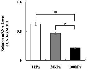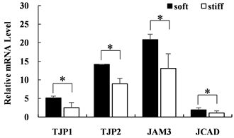 Figure 3. Expression of endothelial cell junctions related-genes decreased on higher substrate stiffness. (a) Transcriptome analysis of cell junction-related molecules by culturing ECs on softer (1 kPa) and stiffer (100 kPa) substrates, including TJP1, TJP2, JAM3 and JCAD (n = 2). (b) The mRNA expression levels of JCAD in HUVECs cultured on 1 kPa, 20 kPa and 100 kPa substrate was analyzed by qRT-PCR. GAPDH was used as the internal control (n = 3), *p < 0.05.