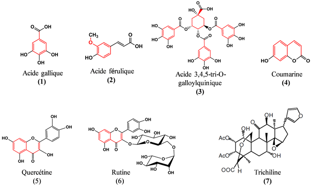 Trichiliaemetica Vahl contains C6-C1 phenolic acids such as gallic acid (1) (Figure 1) in the root bark [14]. Gallic acid shows anti-inflammatory properties by decrease expression and release of pro-inflammatory and inflammatory mediators, such as bradykinine, substance P, Cyclooxygenase 2 (COX-2), Nuclear Factor-kappa B (NF-κB), Interleukin-2 (IL-2), Interleukin-4 (IL-4), Interleukin-5 (IL-5), Interferon gamma (IFN-γ) and Tumor Necrosis Factor α (TNF-α). It also inhibits polymorphonuclear agents involved in the inflammatory response and decreases the activity of myeloperoxidase (MPO) [15] [16]. Root also contains ferulic acid (2) (Figure 1) [17]. Ferulic acid showed promising anti-inflammatory activity (inhibition of TNF-α, Interleukin-6 (IL-6) and COX-2). Gallic acid, ferulic acid demonstrated inhibition of xanthine oxidase [14]. Guierasenegalensis J.F.G.mel contains nine galloylquinic acids, namely 3-O-, 5-O-, 1,3-di-O-, 3,4-di-O-,3,5-di-O-,4,5-di-O-,1,3,4-tri-O-,3,4,5-tri-O- and 1,3,4,5-tetra-O-galloylquinic isolated by column chromatography and HPLC from different plant parts. Among these nine (09) galloylquinic acids, 3,4,5-tri-O-galloylquinic is a new ethyl ester of polyphenol acid (3) (Figure 1). Gallic acid has also been isolated from leaves [18]. In addition, 3,4,5-tri-O-galloylquinic acid isolated from Guierasenegalensis J.F.G.mel. has showed to exhibit anti-HIV activity [19]. Phenols are present in leaves of Calotropisprocera (Ait) Ait.F. and in Crescientiacujete L. fruits [10]. It is recognized that phenolic compounds proceed in the same way as NSAIDs, and some of them inhibit other pro-inflammatory mediators [13].