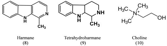 compounds in three (03) plants in exception of Trichiliaemetica Vahl. Basic chemical skeletons of C6-C2-N and C6-C3-N type, similar to nitrogen compounds have not been identified in Guierasenegalensis J.F.G.mel. [18], Calotropisprocera (Ait) Ait.F. [10], and Crescientiacujete L. [11]. Nevertheless, we noted in Guierasenegalensis J. F. G. mel the presence of indolic alkaloids β-carboline type as harmalane, harmane and tetrahydroharmane (Figure 2) [28]. These compounds demonstrated anti-inflammatory activities by suppressing nitric oxide production and secretion of pro-inflammatory cytokines [29]. Similarly, nitrogen compounds like choline has been identified in the latex of the leaves of Calotropisprocera (Ait) Ait.F. Choline is a quaternary ammonium-like proto-alkaloid [30] that showed anti-inflammatory effects. We could not identify structural analogies between these nitrogen molecules, which potent anti-inflammatory properties have been already demonstrated and modern antirheumatics.
