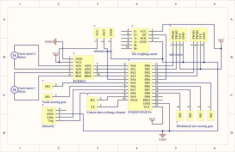 5) Control circuit design: the data output of infrared sensor and load cell is connected to the PA4 and PB4 pins of STM32, STM32 receives data from two sensors to determine whether it is necessary to unload, and when unloading, it sends pulse signals through PA5 and PA6 pins to control two tiller rotations of the car box to unload [12]. The camera transmits data to the STM32 through the serial port, and the STM32 processes the data and then controls the four servos of the robot arm through the four pins from PB5 to PB8 to complete the picking action. The PA8 pin of the STM32 is connected to the Echo pin of the ultrasonic module, which is set high when the ultrasonic module starts working, and the PA7 is connected to the Trig pin, which is set low when the ultrasonic module receives the echo. The STM32 determines whether the PA7 pin is low or not,