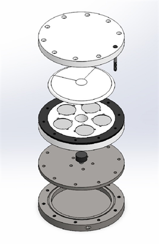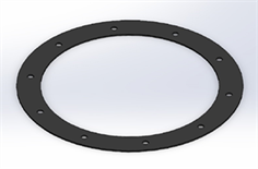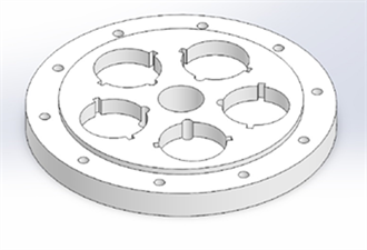 The base plate was designed to house the stacks of piezos, which maintains the diameter of 23 cm. The base will be made from polycarbonate. This material allows for the ultimate impact strength and as an electrical insulator. Pockets will be milled out to house the piezo stacks. Holes are drilled down through the stack pockets to allow the wires from the piezos to connect in the cavity of the subbase plate where the circuitry is housed. In the center of the base will be an overload stopper (Figure 6(b)). If too much stress is applied to the top plate, the distributor will contact the overload stopper and bottom out. This is designed to prevent vehicles that are above target weight to damage our harvester module. A groove is additionally milled on the bottom side of the base plate to allow for a seal, which prevents moisture from entering. When the top plate is compressed by the passing car, it needs to be able to spring back to its original position. This is performed mainly by a stack of thin neoprene spacers (Figure 7) in between the base and top plate. Multiple thin layers of neoprene are used instead of one thick layer to allow for more flexibility. The neoprene spacer not only acts as a spring but also acts as a seal to prevent moisture from entering. A support spacer (Figure 8) is then needed under the base plate. This prevents any deflection from occurring in the base plate. Holes are then matched to correspond with the wire feeds coming down through the base plate. In the center of the spacer, is a tapped hole for fastening the overload stop. This support spacer will be made from 304 stainless. The sub-base plate (shown in Figure 9) is the fixed rigid body where all the circuitries will be housed. This will be made from 304 stainless because of its strength and corrosion resistance properties. The outer ring will be drilled and tapped used to fasten all layers of the harvester together. The milled groove will be for a seal to prevent moisture from entering. A slot will be milled in the side to allow for wires to be ran externally. The overall assembly is illustrated in Figure 10.