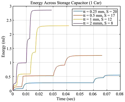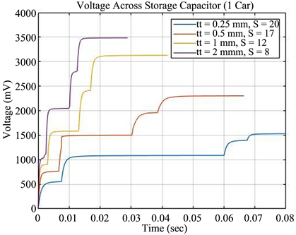 In this section, the MATLAB/Simulink model explained in Section 3.2 will be used to simulate the behavior of the proposed harvester when the piezoelectric dimensions are varied. The Piezoelectric parameters and the vehicle data used for this simulation are shown in Table 1. Note that when the PZT Disk thickness is selected as [0.25 mm, 0.5 mm, 1 mm, 2 mm], the number of PZT stack layers will be selected as [8] [12] [17], respectively. Figures 13-16 illustrates the voltage, current, power, and energy responses according to the data in Table 1.