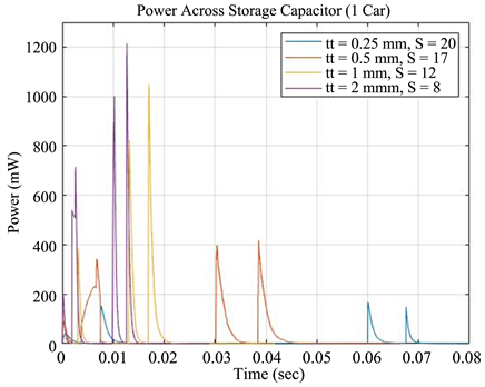 It is apparent after observing all the graphs, that a thickness of 2 mm is the best choice from the measured thicknesses. A thickness of 2 mm with provides the highest peaks of current and power across the storage capacitor, as well as the highest stored voltage and energy in the storage capacitor.