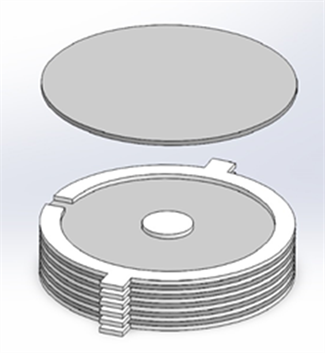 The stack, shown in Figure 3 is constructed of multiple layers that are separated by a transfer column and outer ring made from acrylic. The transfer column is a puck-like structure that is positioned in the center of the piezo. The function of the transfer column is to point load the force in the center of the piezo to maximize deflection. The outer ring provides spacing for the center of the piezo to deflect and wire connections to be made. Both pieces are made out of acrylic due to the electrical insulation and hardness material properties. Determining the piezo thickness will affect how many layers will be in each stack. The overall thickness of the stack will be constant due to the finite limit of our harvester while the thickness of the piezo is varied.