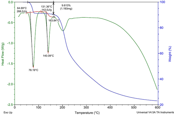 Aspartame: In addition to aspartame, this composition includes dextrose and maltodextrin. In the case where Acesulfame Potassium (Ace-K) is included in the composition, the thermograms were very similar. Figure 3(a) shows Endothermic event with enthalpy of 282 J/kg, onset around 65˚C, and peak at about 80˚C, with accompanying mass loss. The second endothermic event with enthalpy of 157 J/kg, has onset around 139˚C, and peak at 145˚C. These two events are similar to the signature events of dextrose described earlier. The third endothermic event with peak at 213˚C and accompanying mass loss may be attributed