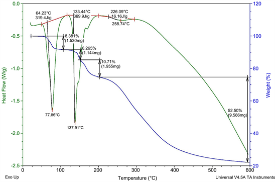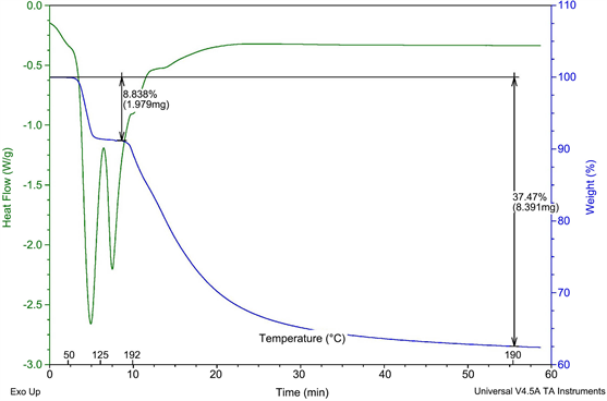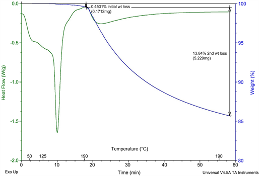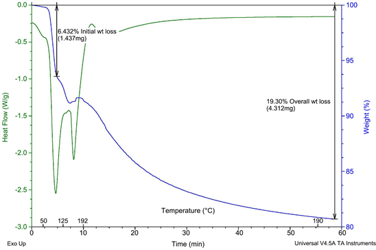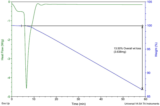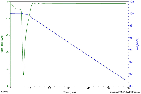 and almost complete loss of mass, with practically no residue at the second event suggests the release of gasses and/or water. Figure 9(b) shows heat flow and mass loss during the “baking process”. The vaporization regime is arrived at within 10 minutes of initial heating, but relatively small loss of mass of less than 10%, during the “baking process”.