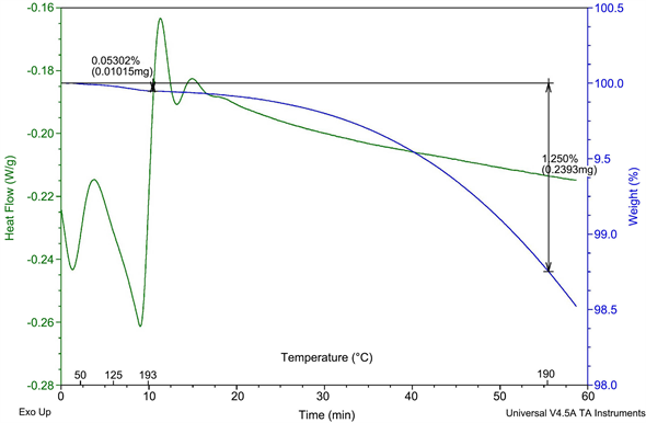 Figure 5. (a) DSC and TGA of Acesulfame Potassium with Dextrose, Cream of tartar, and calcium silicate. between room temperature and 600˚C; (b) Ramp up and isothermal (190˚C) heat flow and weight changes as a function time of Acesulfame Potassium with dextrose, cream of tartar and calcium silicate.