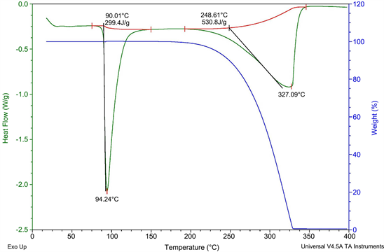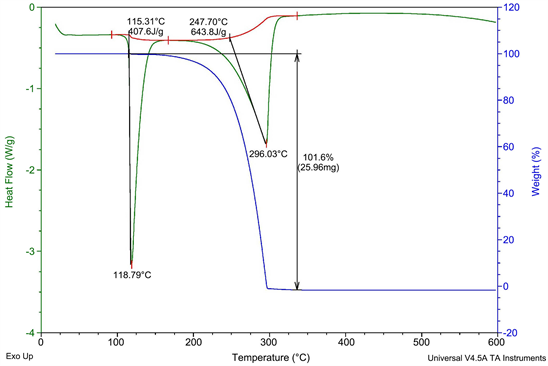 Monk fruit extract: The composition studied included erythritol. Figure 9(a) shows an endothermic event with onset around 115˚C and peak at about 120˚C, with very little mass loss, is attributed to the apparent melting of Erythritol along with Monk Fruit extract. The second endothermic event with onset around 200˚C and peak around 308˚C, accompanied by significant mass loss is attributed to vaporization of erythritol and the Monk Fruit extract. The rapid