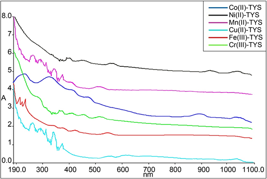 The presence of these four weak bands is indicative of axial elongated distorted octahedral geometry for these Fe(III) complexes. So, the values of different crystal field parameters have not been estimated due to the high spin nature of Fe(III) metal. The suggested geometry of the reddish brown Fe(III)-TYS complex depends on a bidentate nature of ligand, chlorides and water which allow six coordination numbers around Fe(III) that confirm distorted octahedral structure. The first bands in the UV/Vis spectra of Fe(III) which exhibits in the region range 300 - 350 nm due to ligand metal charge transfer.