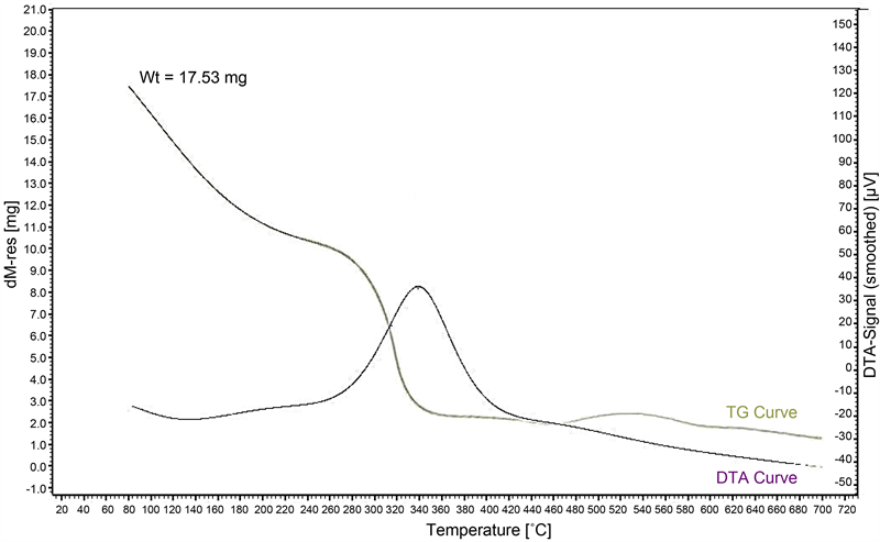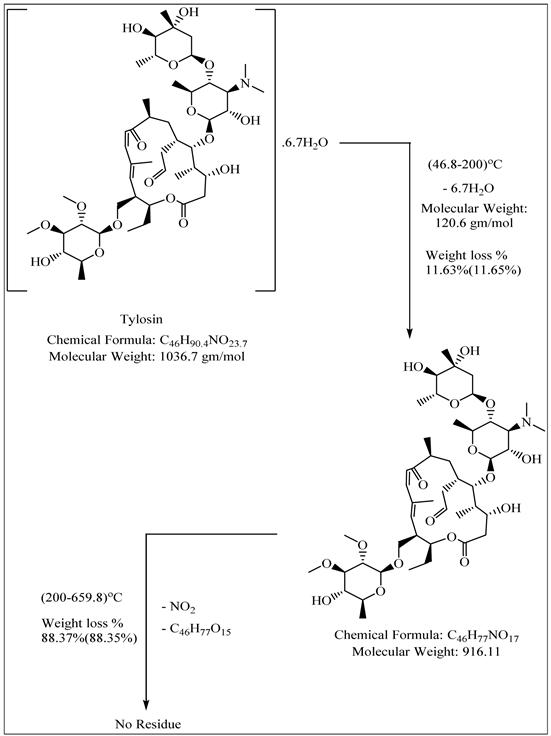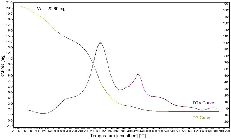 Differential thermal analysis (DTA) and thermo gravimetric analysis (TG) of tylosin and its metal complexes were carried out using the instrument LINSEIS PT1600. The rate of heating was 10˚ K/min. The cell used was platinum and the atmospheric nitrogen rate flow was 15 ml/min.