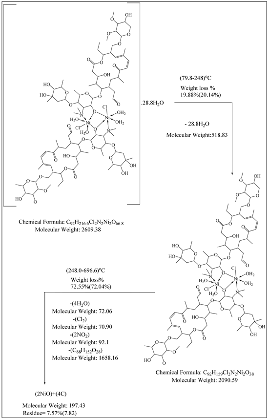 KJ/mole. The orders of the reactions are 1.46 and 1.40 respectively, indicating the first order for both of them. This can be demonstrated by TGA data which Ni(II) complex shows thermal stability till 79.8˚C and produced well defined two peaks at (79.8˚C - 248.0˚C), (248.0˚C - 696.6˚C) with a weight loss of 19.88% which represent the dehydration of this complex and 72.55% that describe the cracking of rest molecule except for the ratio of remained part 7.57%. The process of decomposition of the complex ended with the formation of two moles of metal oxide NiO and 4C. The decomposition technique can be shown in Scheme 3. The values of DTA thermodynamic analysis parameters of Tylosin and its metal complexes such as activation energy (ΔE*), enthalpy of activation (ΔH*), entropy of activation (ΔS*) and Gibbs free energy (ΔG*)calculated and summarized in Table 4.
