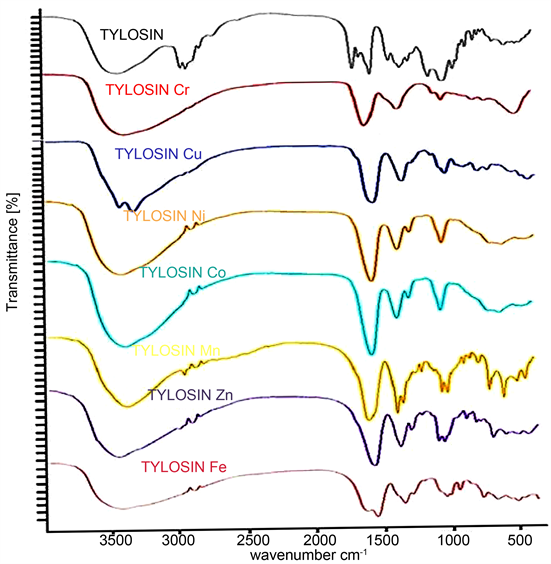 The infrared spectra of tylosin and its metal complexes were obtained in a KBr disc using The Bruker Tensor 37 FT-IR instrument which is located in the central lab, Alexandria university, covering frequency range of 400 - 4000 cm−1 and the data recorded and refined by OPUS Data Collection Program.