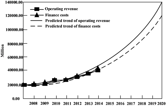 According to the operating income and operating cost from 2008 to 2013, the platform automatically draws the corresponding trend line. The user can choose to predict the next few years, and the forecast line will extend automatically, as shown in Figure 2. It is predicted that the operating income of 2008 is 41,829,787,656 yuan, the actual amount is 38,721,656,259 yuan, and the error rate is 8%. It is predicted that the operating income of 2009 is 54,795,373,842 yuan, the actual amount is 68,078,217,820 yuan, and the error rate is 0.05%. It is predicted that the operating income of 2010 is 67,497,346,641 yuan, and the actual rate is 68,078,217,820 yuan, and the error rate is 1%. It is predicted that the operating income of 2011 is 78,313,511,241 yuan, and the actual operating