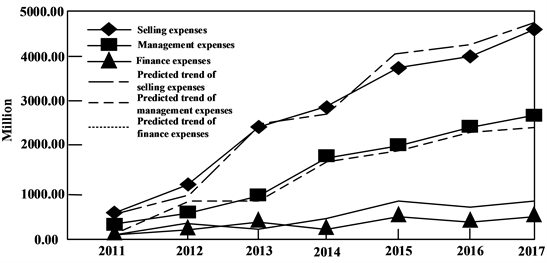 It forecasts the financial situation of the group’s sales expenses, management expenses and three expenses of financial expenses, and now there are 2011-2017 years of actual financial situation. In 2011 years, the forecast sales cost is 2847458501.50 yuan, the actual amount is 3071521304.81 yuan and the error is 3%. In 2012, the forecast sales cost was 3272341449.25 yuan, the actual sales cost was 3288786883.64 yuan, and the forecast error was 0.5%. In 2013, the sales cost was 3857956.28 yuan, and the actual sales cost was 4407325498.15 yuan, and the error was 3%. In 2014, the sales cost was 4,394,103,832 yuan, and the actual sales cost was 4417235498.08 yuan, and the error was 0.3%. The sales costs of 2015, 2016 and 2017, and the forecast results for the management and financial costs of each year are shown in Figure 2.