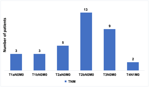During the study, thirty-five (35) radical nephrectomies for kidney cancer were performed which was 57.14% of all nephrectomies and 2.40% of all procedures performed. The average age was 46.5 ± 12.5 years with extremes of 21 years and 72 years old and women represented 70% of patients, a sex ratio of 3/1. The computed tomography was the imaging test for the diagnosis and the assessment of extension in all our patients. The average tumor size was 11.6 cm (±3.4 cm). Thirteen (13) patients (37%) were diagnosed at stage T2bN0M0 (Figure 1).