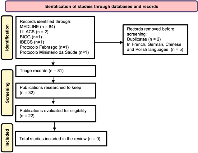 The exclusion criteria were articles with research not correlated to human beings, duplicate articles, unavailable in Portuguese or English, available only in abstract form, articles that did not directly address the studied proposal or did not meet the other inclusion criteria. After reading the titles and later the abstracts, 32 articles were considered by the selection criteria, of these 10 articles were not accessible for full reading and another 13 were excluded due to inadequacy to the theme, ending the total of 9 articles and including 2 that contemplate national guidelines. The results were presented in a descriptive way, divided into thematic categories addressing the various national and international guidelines (Figure 3).